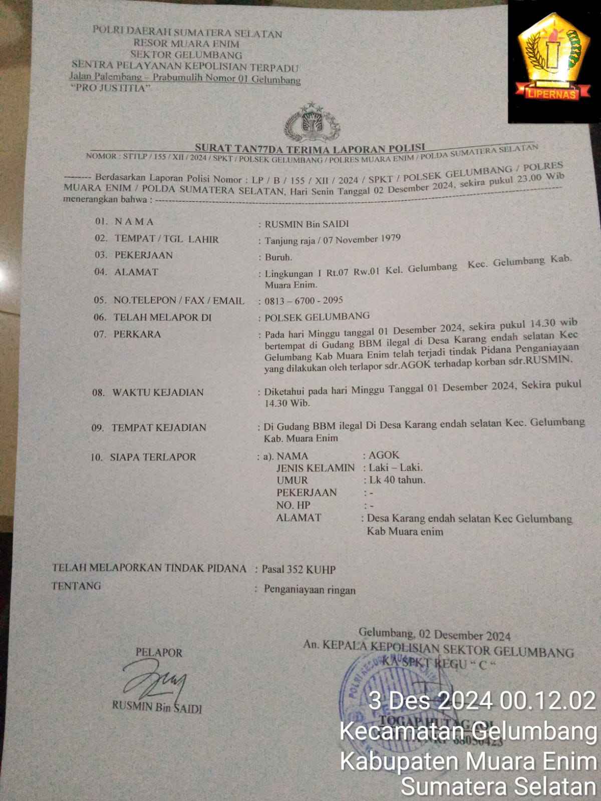 Diintimidasi Saat Meliput Terbakar nya Gudang BBM Ilegal Di Karang Endah, Rusmin Resmi Buat LP di Polsek Gelumbang