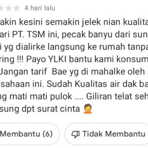 Dalam akun tersebut, konsumen atas nama (M) menjelaskan “(red_) semakin kesini semakin jelek nian kualitas air PT.TSM ini, pecak banyu dari sungi musi yang di alirke langsung ke rumah tanpa di saring !!! jangan tarif bae yang di mahal ke oleh perusahaan ini.Sudah kualitas air yang dak bagus, sering mati mati pulok …..giliran telat sehari langsung dpt surat cinta,” keluhnya.