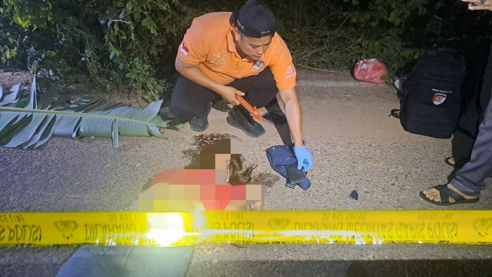 Dalam olah TKP, petugas memasang police line, melakukan identifikasi, serta mengumpulkan sejumlah barang bukti, di antaranya tas selempang kecil biru, satu unit handphone dengan layar pecah, tutup box aki motor, serta pakaian korban berupa kaos merah dan celana jeans biru. Polisi juga telah meminta keterangan dari dua orang saksi di lokasi kejadian.