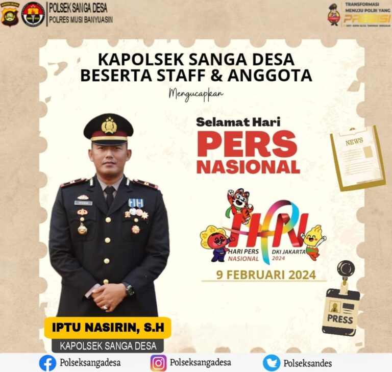 Sandes (Muba) Lidiksumsel.com – Kapolsek beserta Staff dan anggota polsek Sanga Desa Muba, Iptu Nasirin SH, menyampaikan ucapan selamat kepada wartawan Indonesia yang telah merayakan Hari Pers Nasional (HPN) 2024 pada jumat, (9/2), yang secara nasional diperingati di jakarta.