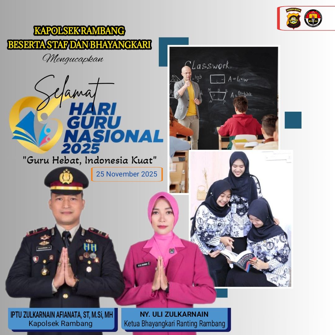 MUARA ENIM – Dalam rangka memperingati Hari Guru Nasional yang jatuh pada hari ini, 25 November 2025, Kapolsek Rambang, Iptu Zulkarnain Afianata, S.T., M.Si., M.H., menyampaikan ucapan selamat dan apresiasi setinggi-tingginya kepada seluruh tenaga pendidik, khususnya di wilayah Kecamatan Rambang, Kabupaten Muara Enim.