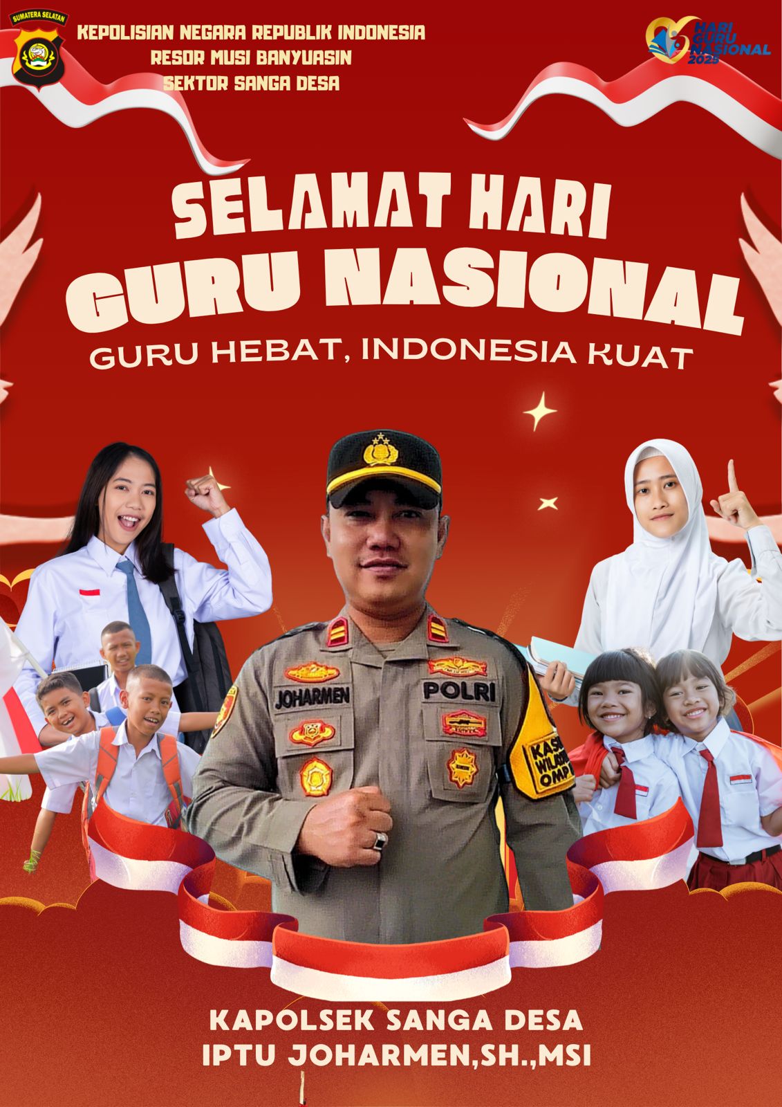 MUSI BANYUASIN, lidiksumsel.com – Dalam rangka memperingati Hari Guru Nasional (HGN) yang jatuh setiap tanggal 25 November, Kapolsek Sanga Desa, IPTU Joharmen, S.H., M.Si., menyampaikan ucapan selamat dan apresiasi setinggi-tingginya kepada seluruh guru, khususnya yang berada di wilayah Sanga Desa, Kabupaten Musi Banyuasin (Muba).